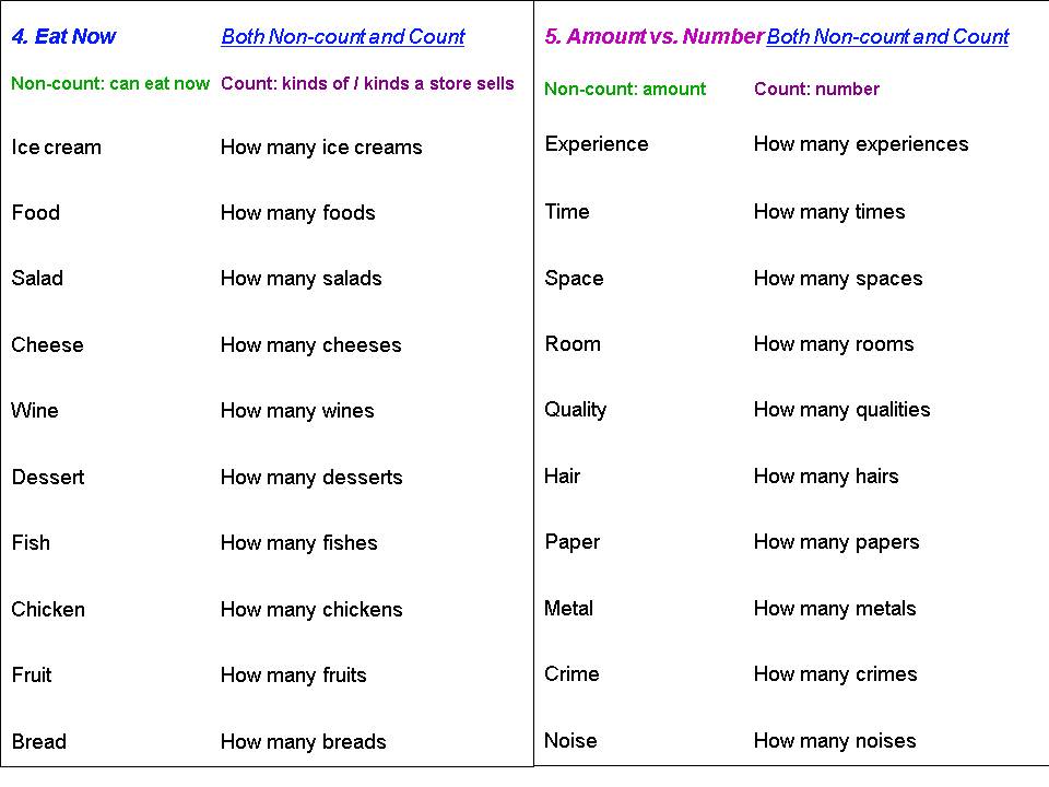5. Amount vs. Number: these non-count nouns can also be count nouns. Count nouns focus on number: How many times have you gone to your office? In contrast, non-count nouns focus on “amount”: “How much time do you work there each day?