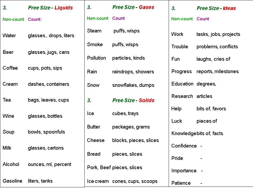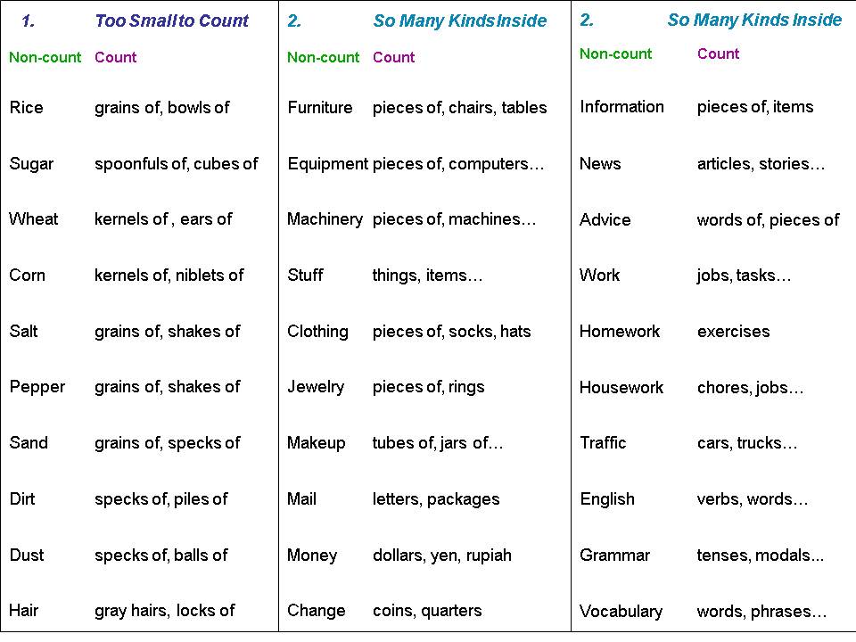 One major difficulty in working backwards is that students don’t know the logic behind non-count nouns in the first place. So, on the slides below I put non-count nouns into five main logical groups. The most common non-count nouns are in the left column: in the right column are the words that change them into count nouns.