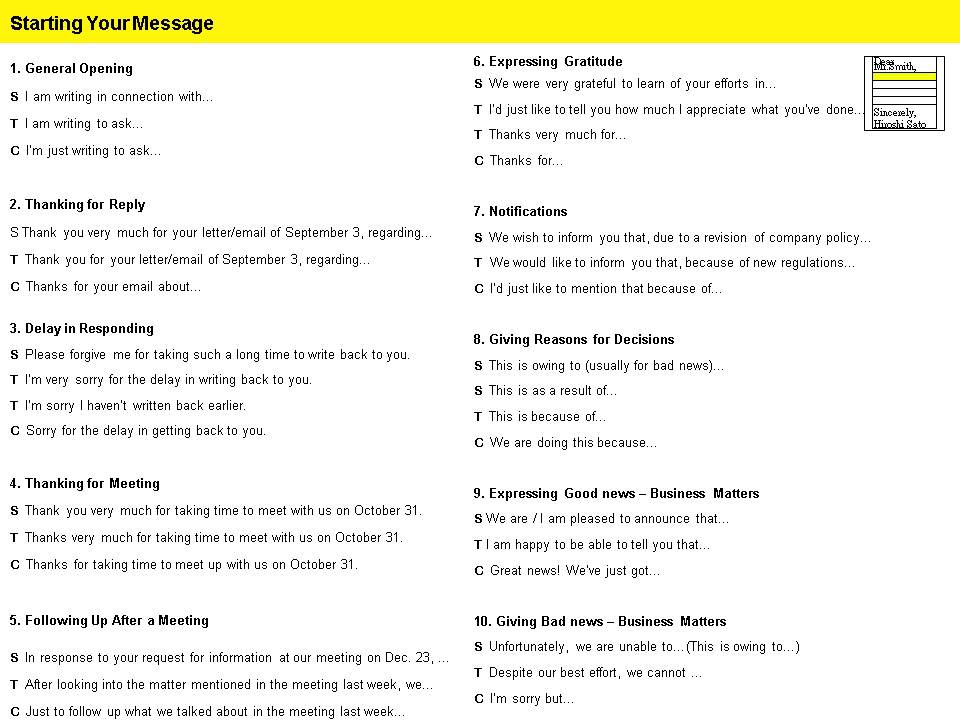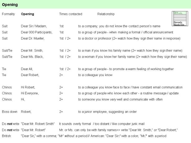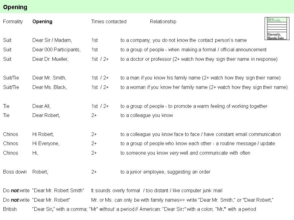– Different levels of politeness for Opening (eg. Dear Mr. Smith,)