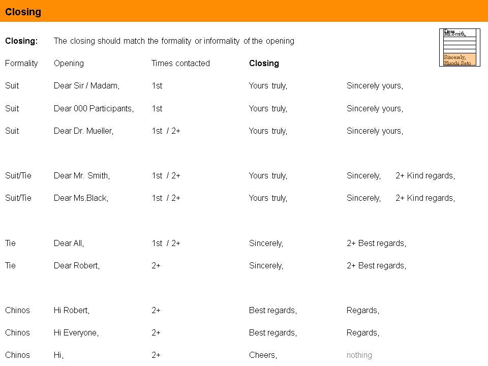 Second, third, fourth contact: unlike Japanese email, which often stay at Suit level no matter how many times contacted, international emails will probably drop to Tie or Chinos from the second, third, fourth or fifth email, depending of course on the purpose of the communication.