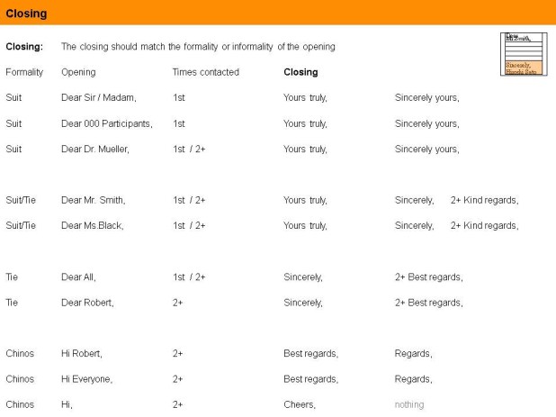 Have you met your reader before in a face-to-face meeting, a teleconference or a TV conference? If yes, you should use Tie or possibly Chinos phrases to signal friendliness.
