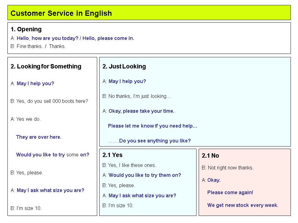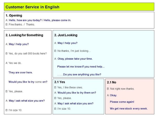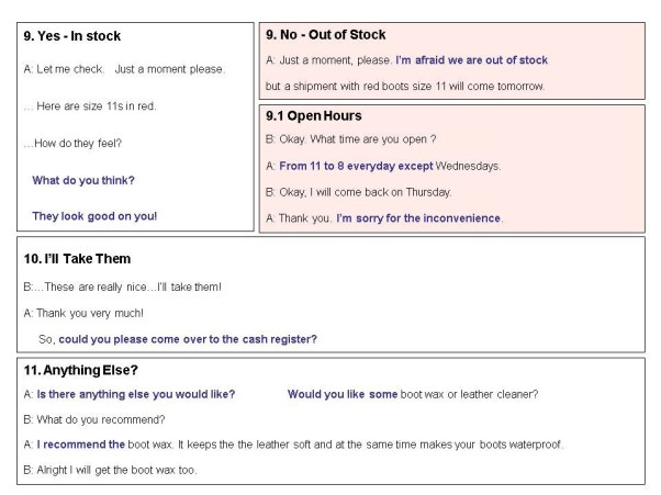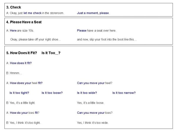 In the slides below, the key customer English phrases are highlighted in blue. In this case, the product being sold is boots, but I believe this role-play can be easily adapted to different products.