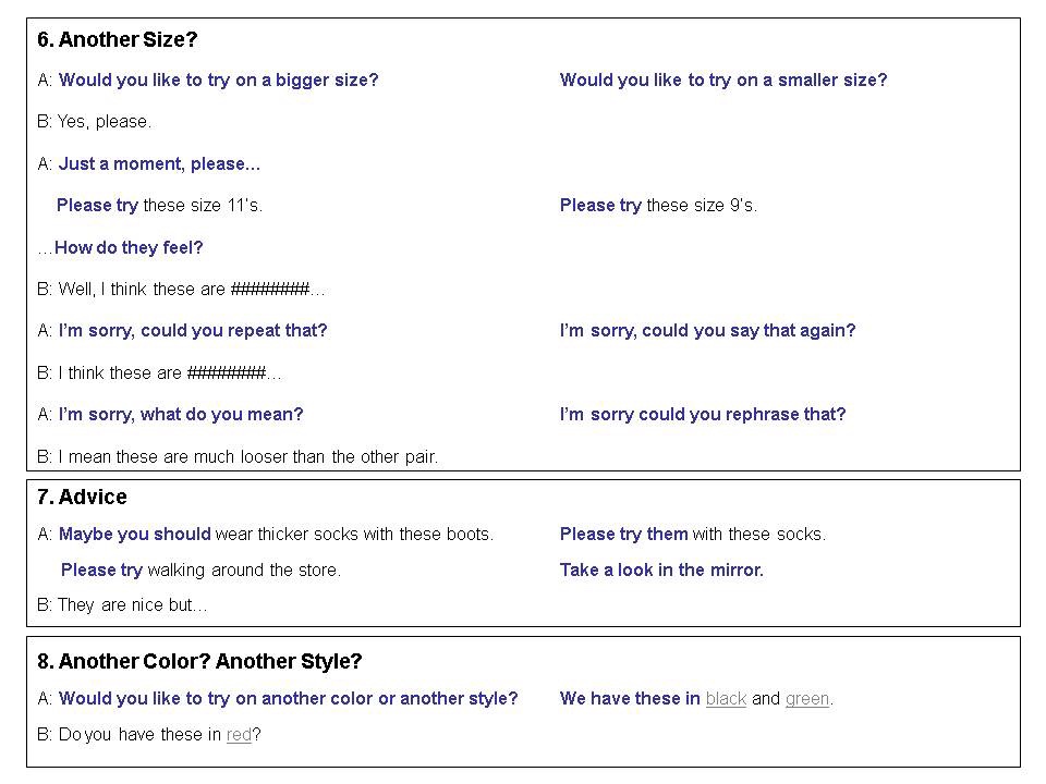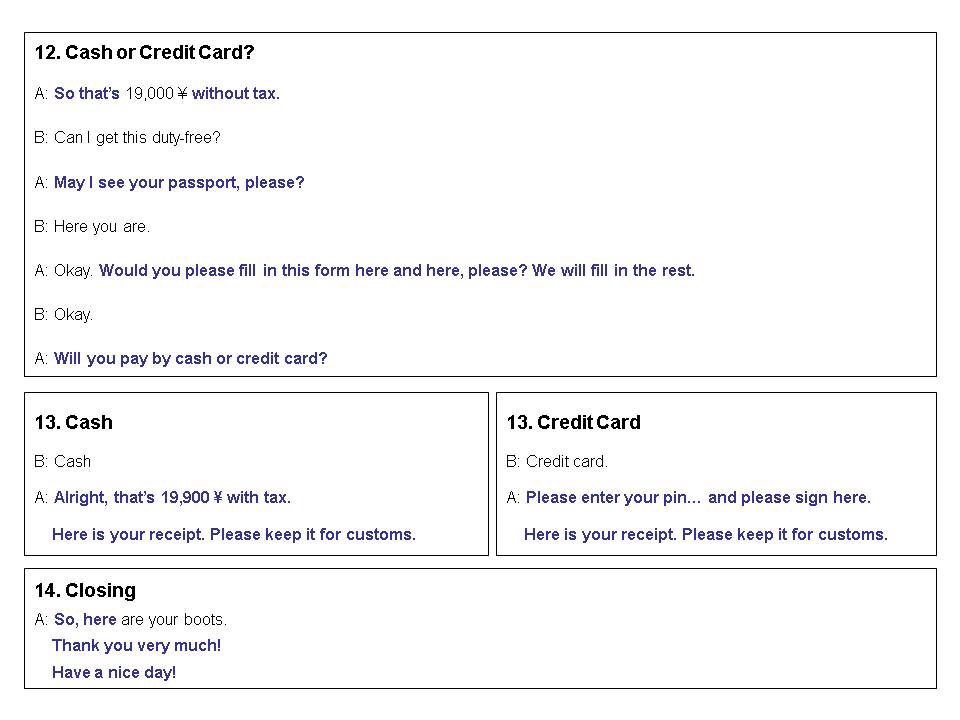 Each week we would review the previous week’s role-play situations and then learn one or two more situatuions. We studied fourteen different situations from greeting customers, to checking the fit, to paying by cash or credit card. I also included phrases like “I’m sorry could you say that again?” and “What do you mean?” in section 6 for situations in which clerks have trouble understanding customers’ English.